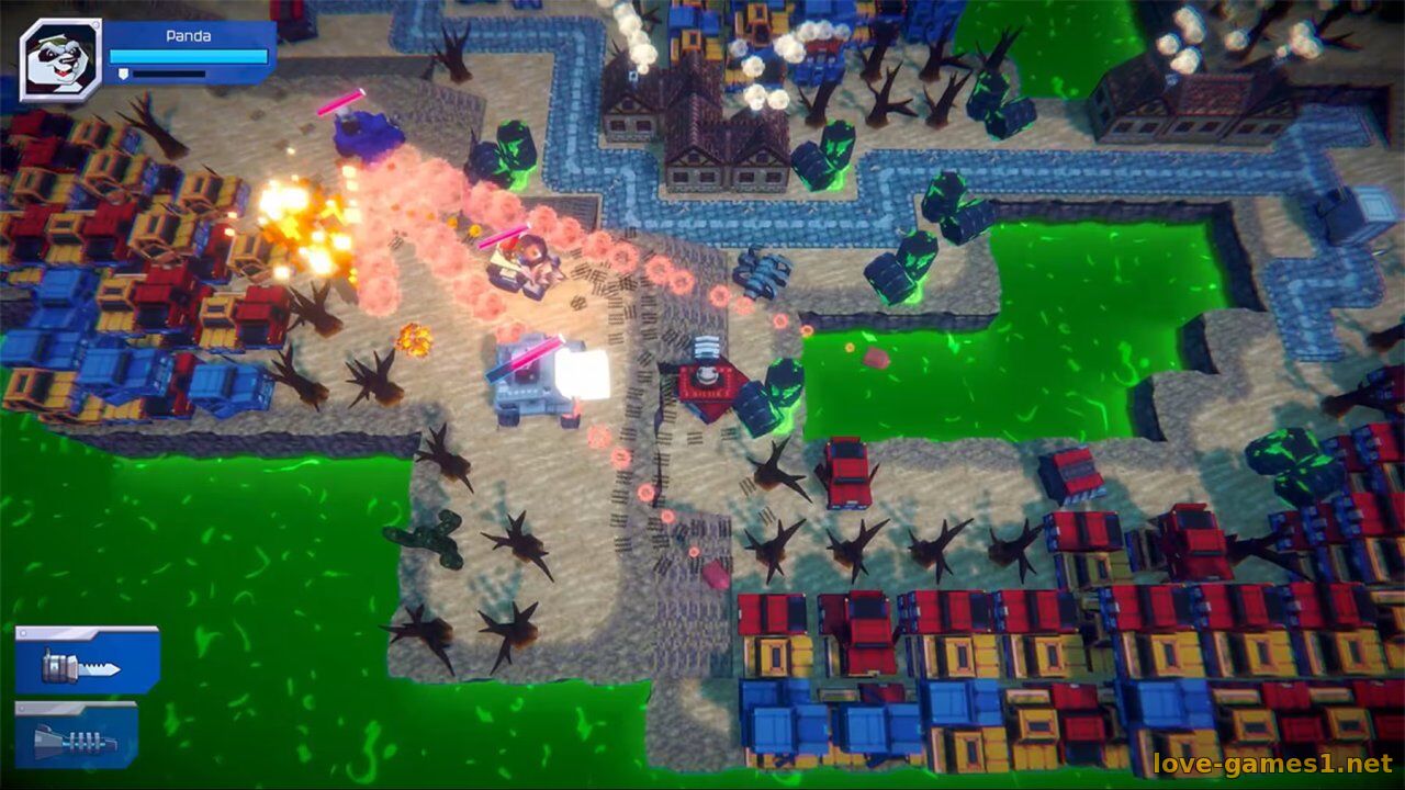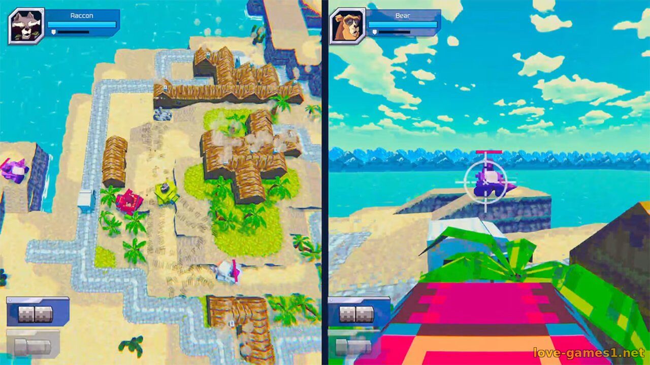 Отправляйтесь в бой в роли енота, медведя, волка или панды и проложите свой путь через 5 причудливых воксельных миров, полных взрывов и сомнительных военных решений.