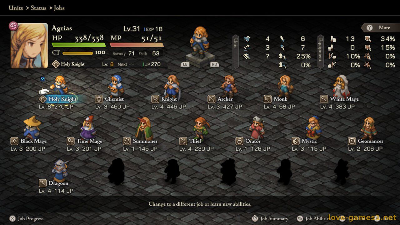 Создавайте собственные стратегии, экспериментируя с разнообразными профессиями и способностями. Набираясь опыта, бойцы вашего отряда получают доступ к новым профессиям с особыми способностями. Каждая освоенная способность остается у персонажа даже после того, как он сменит род занятий. Всего в игре доступно более 20 профессий. Экспериментируя с сотнями способностей, даваемых ими, вы сможете найти сочетания, которые лучше всего подходят именно для вашего отряда. Кроме того, вы сможете приручать и брать с собой на битву чокобо и других существ.