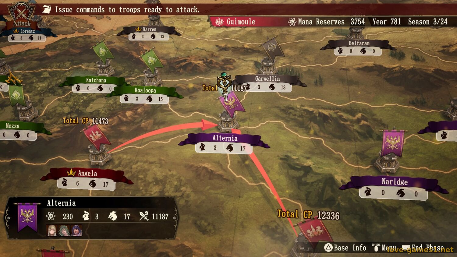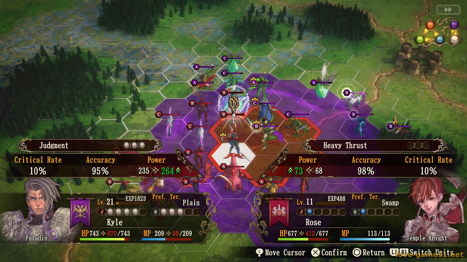 В фазе атаки происходят пошаговые сражения отрядов на карте, состоящей из шестиугольных ячеек. Используйте навыки юнитов, стихии, эффекты окружения, преимущества местности и другие тактики боя, чтобы привести свою сторону к победе! Все нации, рыцари и монстры в игре будут продолжать сражаться и развиваться вместе с вами.