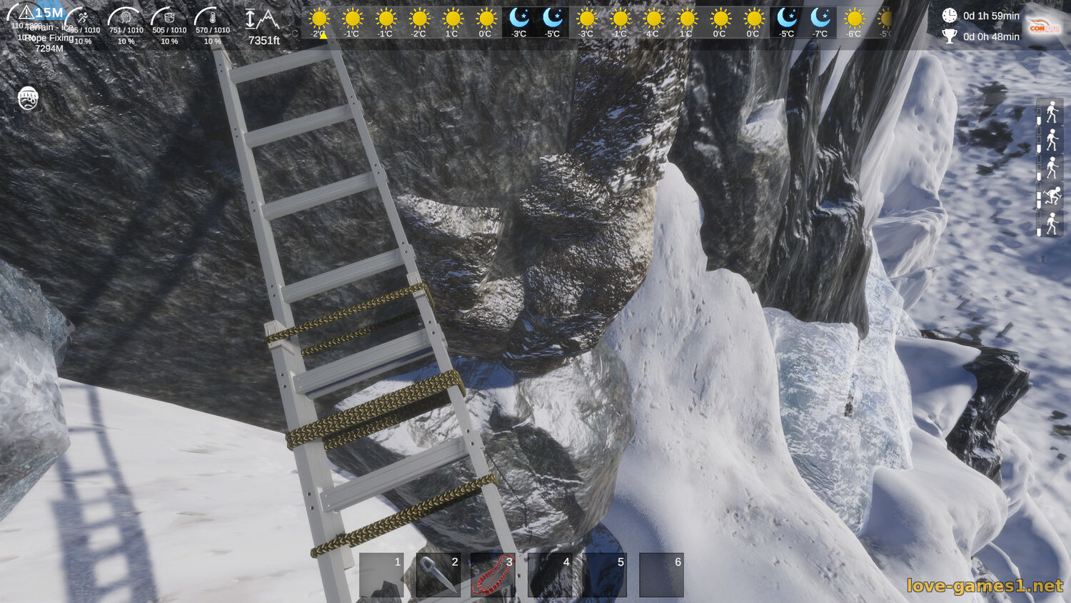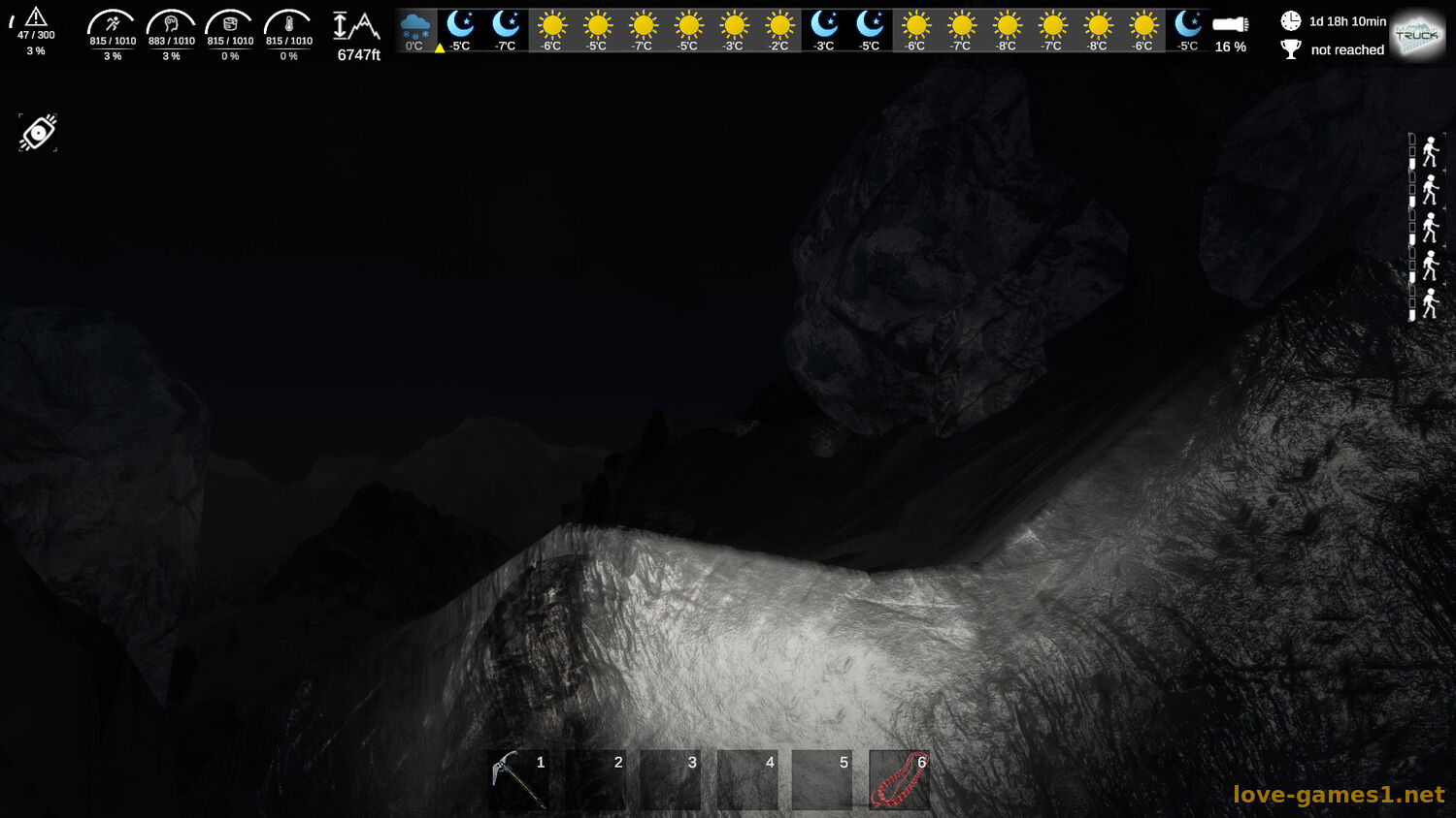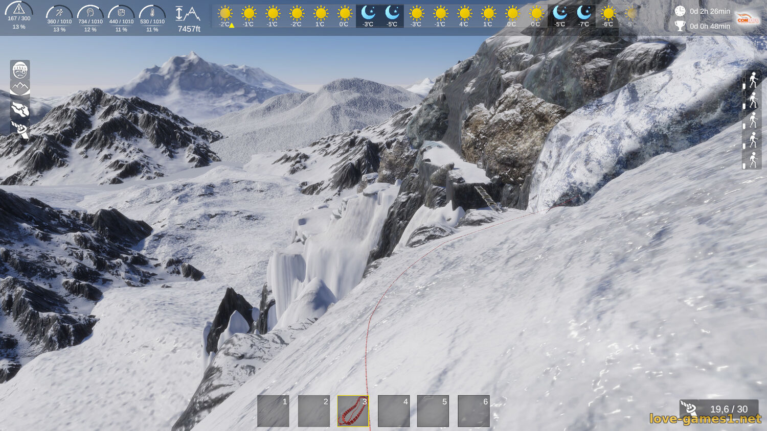 Каждый путь - это новое ипытание. Опасные траверсы, вертикальные стены, каменные выступы - это только начало препятсвий, с которыми придется сталкнутся во время экспедиции. Чтобы выжить - укрепляй канаты, используй специализированное снаряжение (альпинистские кошки, карабины, ледоруб и тд).