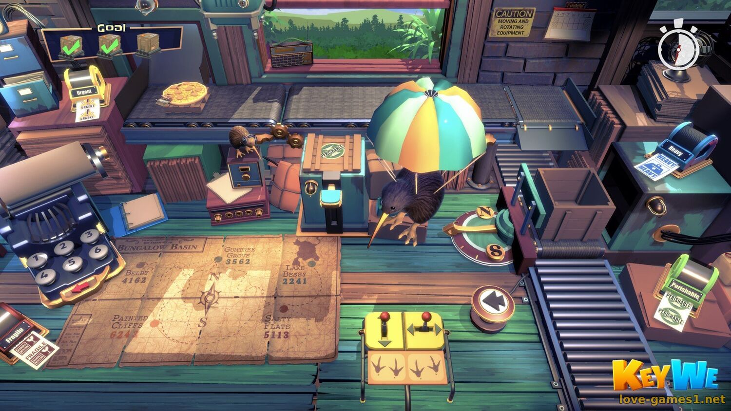 Почта должна быть доставлена! KeyWe — невероятно милая кооперативная головоломка с двумя птичками киви, Джеффом и Деборой, работающими в весьма необычном почтовом отделении. Весь день им приходится бегать, прыгать и активно использовать свои части тела среди невероятного количества рычажков, звоночков и кнопочек, лишь бы вовремя доставить письма — и все это, конечно же, без рук!