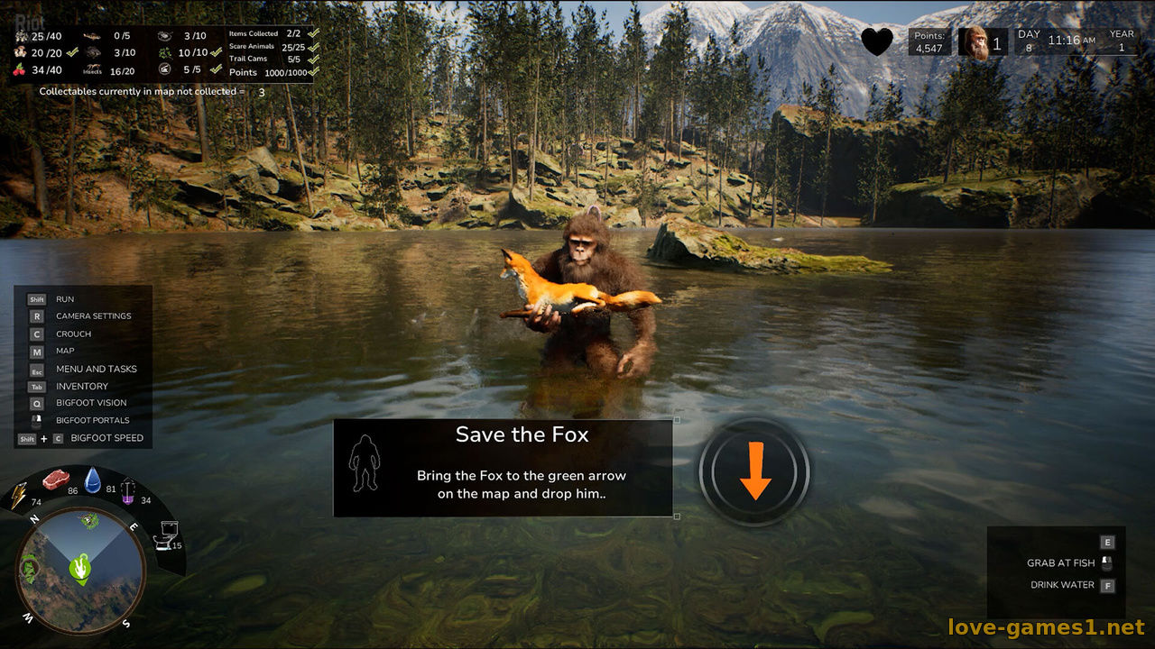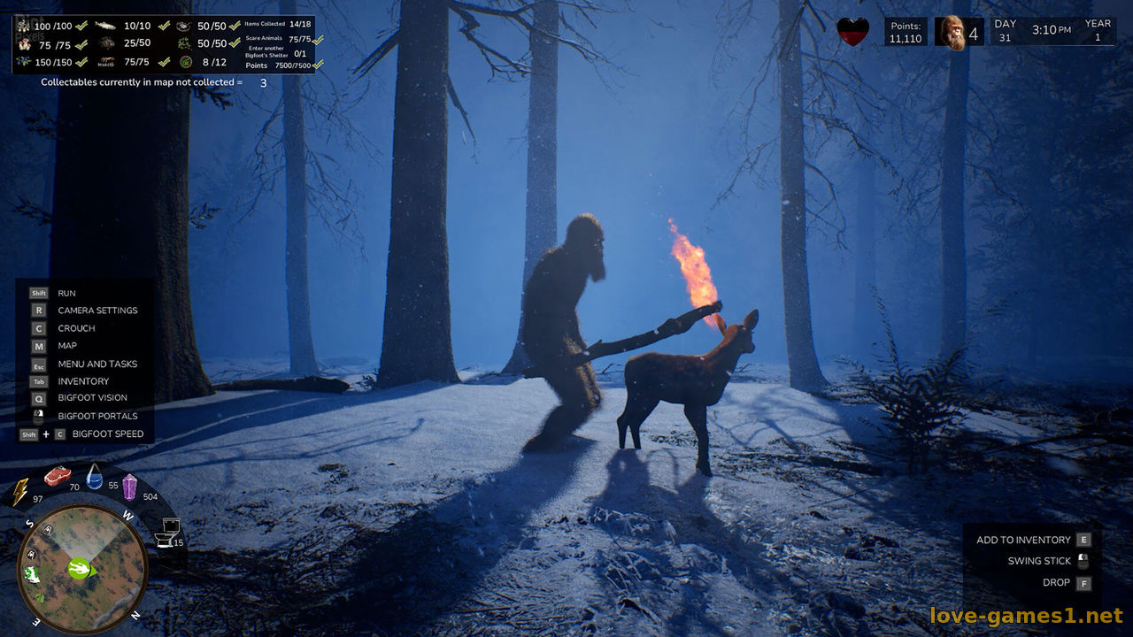 Исследуйте прекрасный лес и живите как Бигфут. Ловите и ешьте рыбу, насекомых и других существ. Вы - невидимый хранитель леса. Собирайте в лесу грибы, ягоды и другие ресурсы. Стройте укрытия, чтобы хранить предметы и пережить суровые зимы. Докажите, что вы - защитник леса, и открывайте особые награды, выполняя испытания. Осваивайте навыки Бигфута - «Зрение Бигфута», «Скорость», «Порталы» и «Сила». Остерегайтесь охотников на Бигфута: они пытаются найти вас и сфотографировать. Воруйте их предметы, чтобы получать очки и завершать задания.